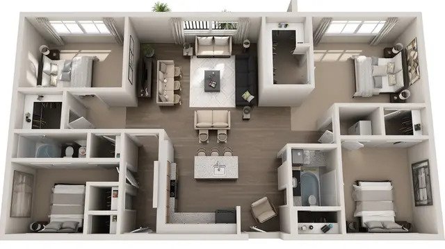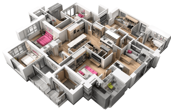 A 3D Design Layout in interior design is a realistic, three-dimensional visual representation of an interior space created using specialized software. It shows the complete layout of a room or property—including furniture placement, materials, colors, lighting, textures, and décor—before actual execution. This helps clients clearly understand how the final space will look and feel.